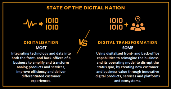 For some, these digitalisation journeys progress into holistic, enterprise-wide digital transformation, as leaders recognize the vast opportunities and significant competitive advantage that their digitalized front- and back-office capabilities make possible, enabling them to reimagine their business and operating models to create new customer, business and/or citizen value through innovative digital products, services, platforms and ecosystems.