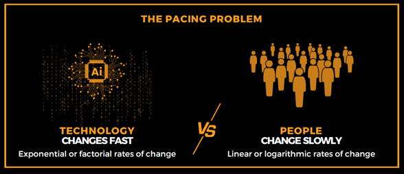 The challenge with this approach is two-fold. Firstly, organizations will encounter the pacing problem. Simply put, technology changes fast, while people change slowly.